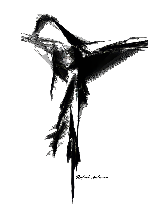 In Abstract Flamenco, Rafael Salazar strips dance down to its emotional essence. Bold black strokes slice and whirl against a stark white canvas, echoing the fierce grace of a flamenco dancer mid-turn. This minimal yet dynamic composition channels raw energy, movement, and passion without revealing a single facial feature—leaving the rhythm to be felt rather than seen.
